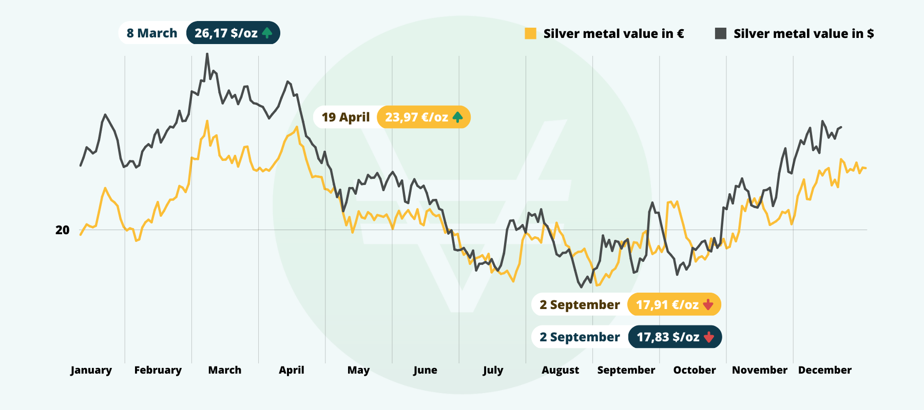 Those familiar with precious metals know this. Normally, the silver price follows the trends of the gold price. With slightly larger movements but still very similar. In 2022, this was not the case for silver in euros. In summary, silver rose less high and for less time. It fell lower, for longer.