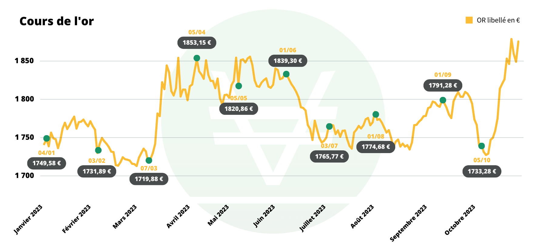- Au fil de l’année 2023, plusieurs périodes étaient favorables à l’achat d’or.