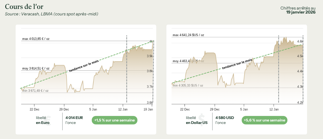 Or, sur la semaine qui suit, le dollar reste sous pression : les marchés anticipent toujours de nouvelles baisses de taux de la Fed en 2026, ce qui maintient les rendements réels très bas et décourage le portage en devise américaine. Dans ce contexte, l’euro se maintient autour de 1,16–1,17 $ (1,164 le 19 janvier à la clôture), de sorte que la hausse de l’once en dollars se transmet presque intégralement au prix en euros. Quand l’once dépasse durablement 4 600 $, cela suffit pour propulser l’once en euros au‑delà de 4 000 € même avec une devise européenne solide.