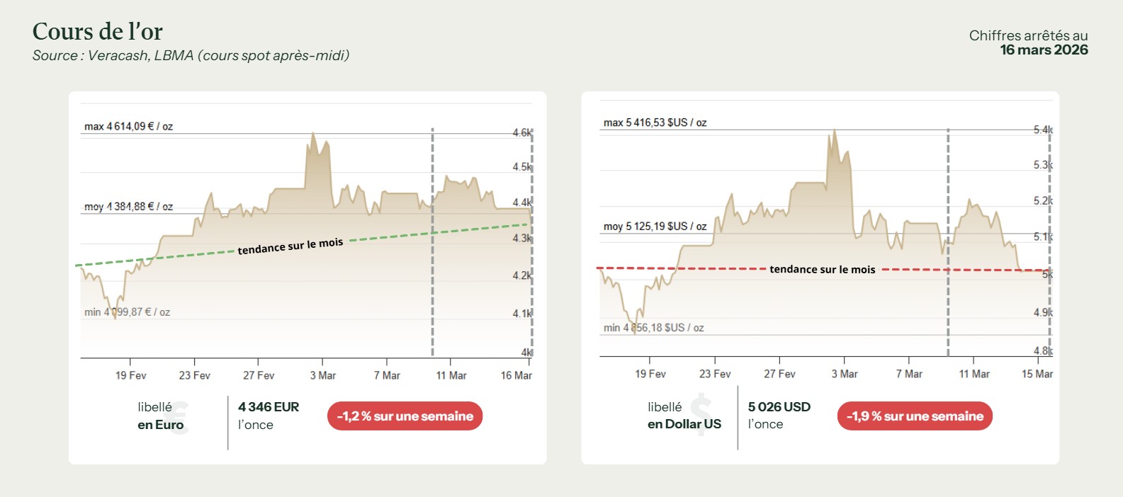 Au final, la période du 10 au 16 mars montre surtout un haut plateau sur le cours de l’or. Pas de panique ni d’euphorie. Les tensions au Proche‑Orient, la cherté du pétrole et la nervosité des actions sont bien prises en compte, ce qui explique le maintien au‑dessus des 4450 € pendant l’essentiel de la semaine. Globalement, la tendance haussière de fond perdure donc, mais l’or est peut-être entré dans une phase où il en faudra un peu plus pour repartir vers de nouveaux records.