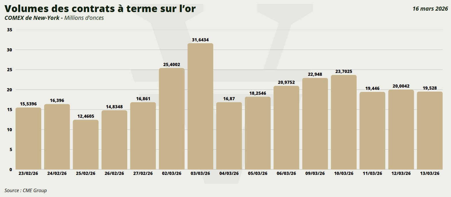 En Asie, la demande physique continue de fournir un filet de sécurité, mais elle n’alimente plus autant la hausse qu’en début d’année. Les données de début mars montrent une divergence nette : en Inde, la hausse des prix locaux vers 160 000 INR pour 10 g freine les achats, même en pleine saison des mariages, et les détaillants signalent une consommation plus prudente. En revanche, la Chine demeure un acheteur régulier : les primes sur l’or à Shanghai tournent autour de 13–15 $ l’once au‑dessus du spot, ce qui indique une demande d’investissement toujours présente malgré un recul d’environ 3 % du prix mondial cette semaine‑là. Ce contraste explique que l’or ne s’effondre pas, mais qu’il ne trouve pas non plus dans la demande physique un moteur pour repartir aussitôt vers de nouveaux records.