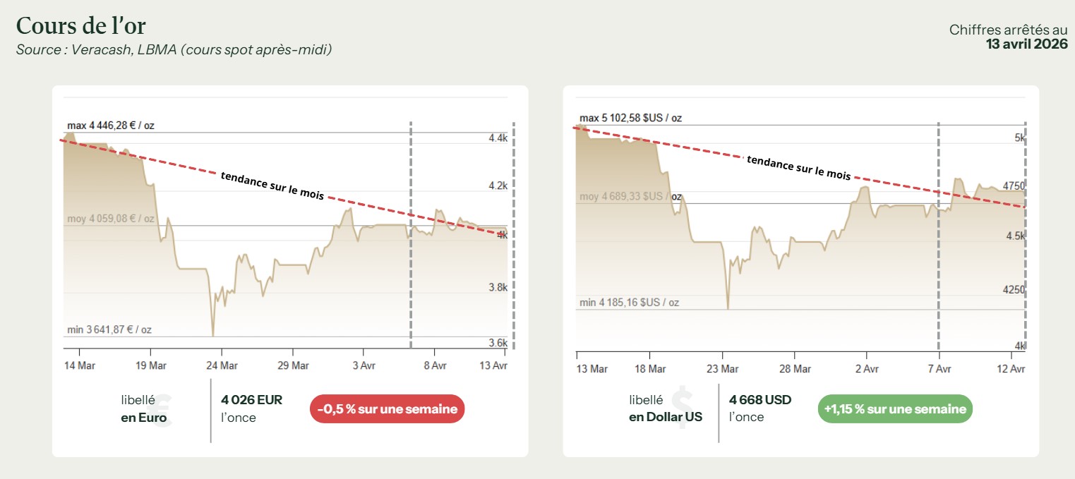 Au total, la semaine du 7 au 13 avril confirme que l’or reste pris entre deux forces opposées. D’un côté, la guerre en Iran, le pétrole cher et la nervosité des actions lui offrent un soutien de fond. De l’autre, la reprise du dollar, la remontée des obligations et les attentes de taux durablement élevés freinent tout emballement. Le métal a malgré tout réussi à rebondir en milieu de semaine, mais sans retrouver une trajectoire franchement haussière. Pour l’investisseur européen, le message est clair : l’or reste un actif refuge, mais dans le contexte actuel, ce refuge avance par à-coups et au prix d’une volatilité qui reste particulièrement élevée.