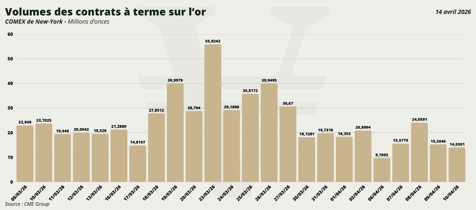 Les derniers mouvements sur le COMEX confirment cette lecture. Les volumes ont fortement accéléré à partir du 18 mars, avec un pic à 55,9 millions d’onces le 23 mars, puis des échanges encore très soutenus autour de 35,8 à 39,9 millions d’onces les 25 et 26 mars, avant de retomber vers 18 à 21 millions début avril. Cela montre un marché encore dominé par les arbitrages tactiques (à court terme) plutôt que par des achats de conviction (à long terme). Quand l’incertitude géopolitique se renforce, les contrats à terme attirent de nouveaux ordres, mais les prises de bénéfices et les ventes de couverture reviennent très vite dès que les prix montent trop. Cela crée une volatilité plus forte que la tendance elle-même. Autrement dit, le COMEX accélère chaque hésitation, chaque rebond et chaque correction.