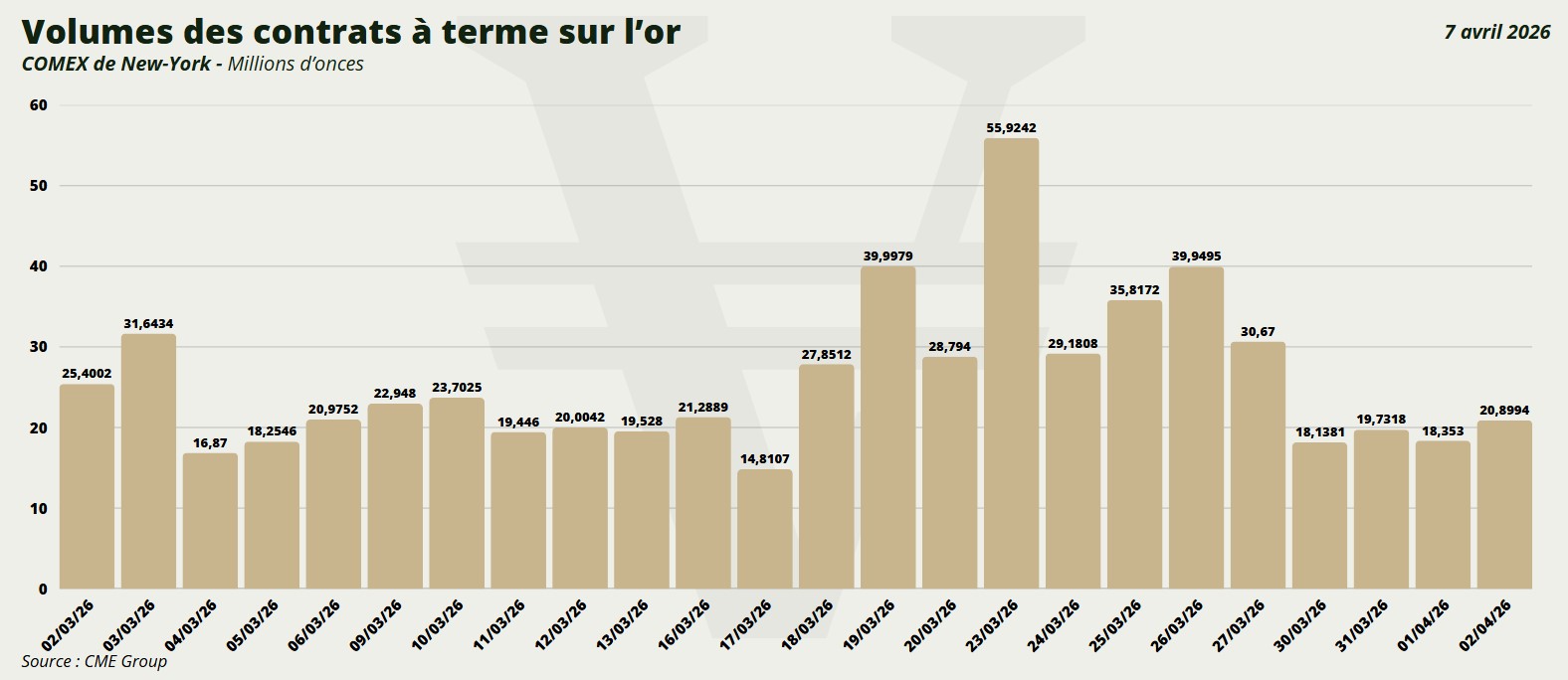 Volumes COMEX de l’or : l’explosion des échanges à partir du 18 mars 2026 et le pic du 23 mars traduisent la panique née du choc de taux et de géopolitique.