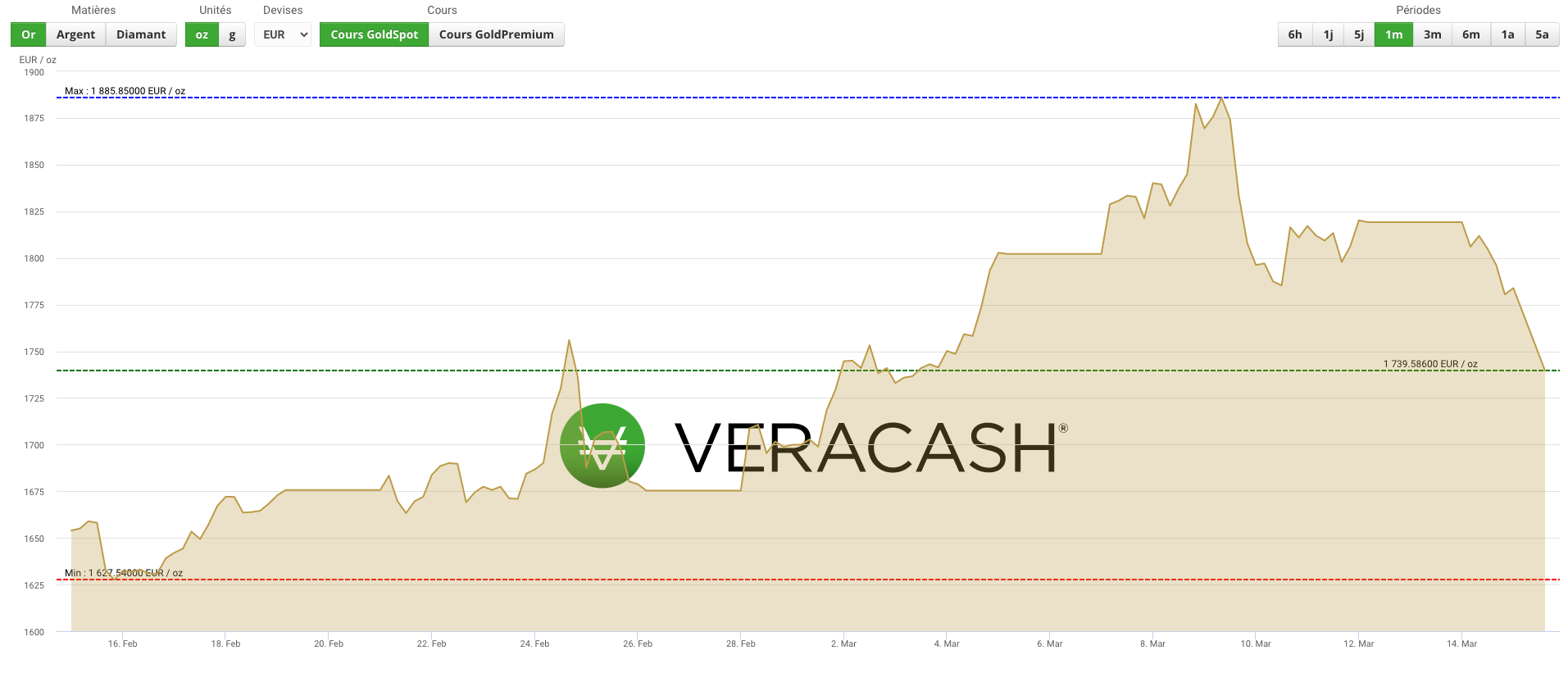 La guerre en Ukraine, les menaces autour des centrales nucléaires, les risques de cyber attaque ont provoqué un mouvement massif d’achat d’or dès le vendredi 4 mars 2022. Mouvement qui se poursuit le 7 mars 2022 avec l’avancée des Russes. Pour la première fois, l’once d’or s’échange au dessus des 1840 euros ! C’est un record historique.
