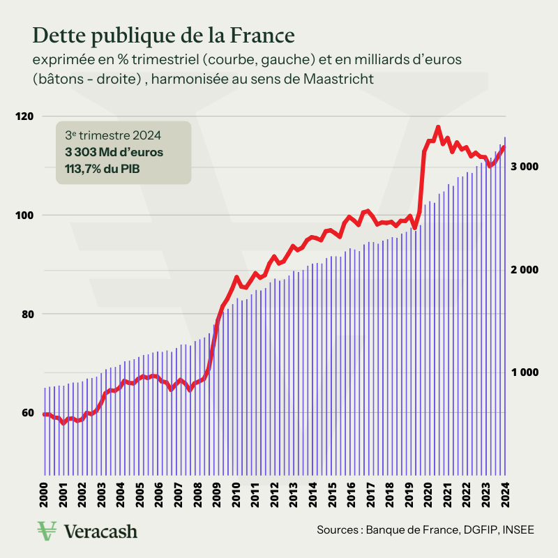La dette publique, qui quant à elle avait déjà franchi un cap historique (environ 3 303 milliards d’euros, soit ~114 % du PIB) en décembre 2024, a continué d’augmenter très rapidement au premier trimestre 2025 : selon l’INSEE, elle a ainsi progressé de 40,5 milliards d’euros, pour atteindre 3 346 milliards fin mars. Le Haut Conseil des finances publiques anticipe désormais un ratio dette/PIB de 115,4 % en 2025, un nouveau record dépassant même celui la crise sanitaire !