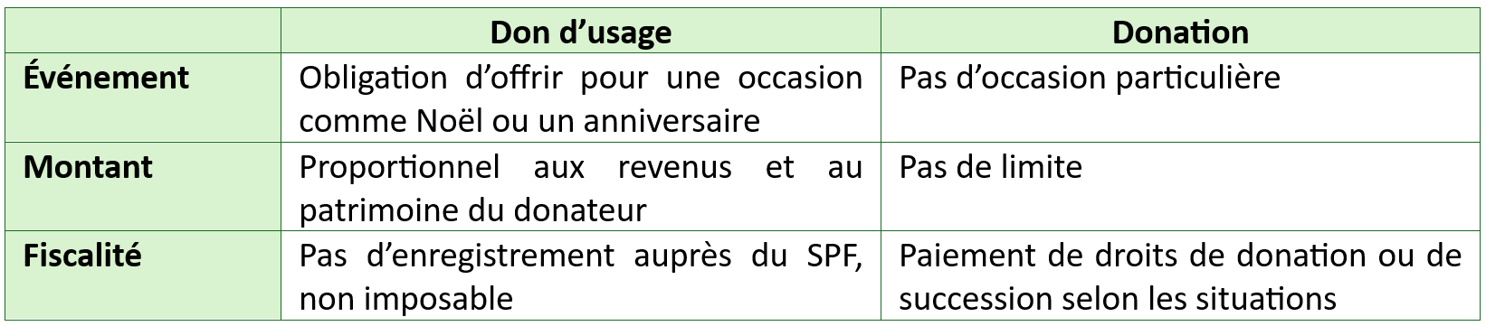 - En Belgique, le don d’usage est à bien distinguer des donations. Celles-ci peuvent donner lieu au paiement de droits de donation ou de succession.