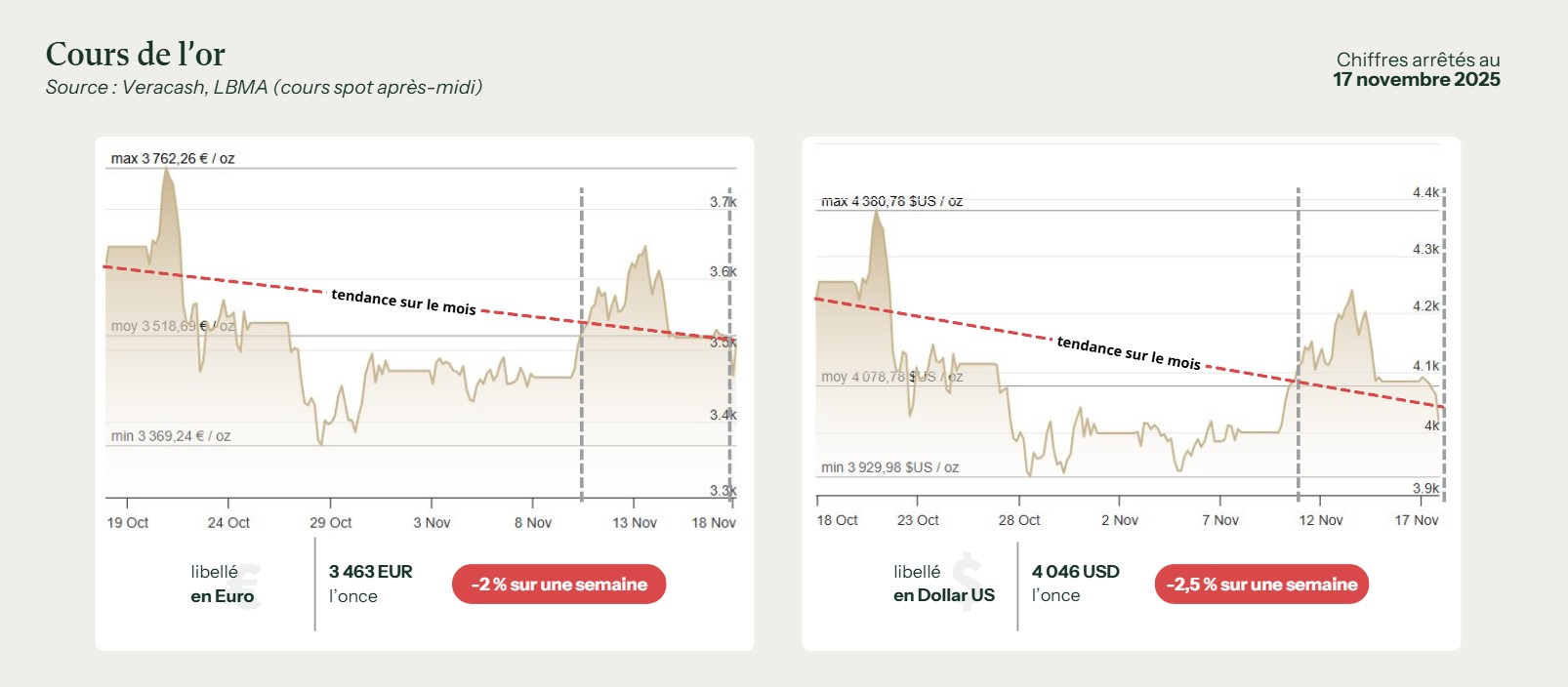 Le 14 novembre, la tendance s’inverse avec une brutalité rare. Alors que les marchés actions et cryptos décrochent, l’or plonge. Mais pour l’épargnant européen, la chute est double : le métal baisse, et l’euro monte.