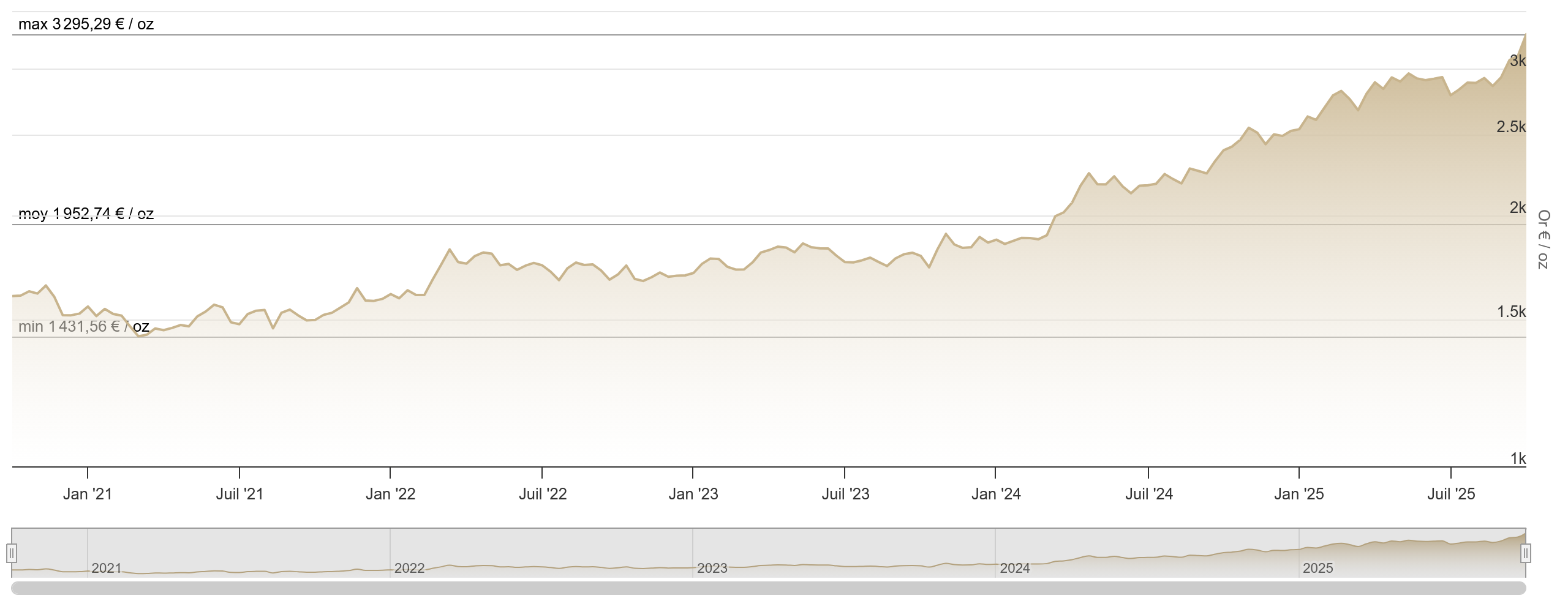 En regardant un peu plus loin dans le rétro, la hausse du cours de l’or est d’autant plus flagrante. En effet, depuis 2022, le prix de l’or a doublé en dollars, et presque doublé en euros (le cours s’élevait à 1 697 euros et 1 653 dollars l’once en septembre 2022). En observant la courbe de l’évolution du cours de l’or sur 5 ans, on remarque bien que la hausse s’est surtout accélérée à partir de 2024.