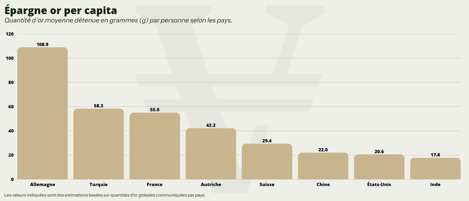 Selon des enquêtes récentes du World Gold Council, plus d’un tiers des Allemands ont à un moment ou à un autre investi dans l’or, et 28 % le font encore aujourd’hui. Ainsi, les ménages privés allemands détiennent environ 109,5 grammes par personne, ce qui fait de l’Allemagne le leader mondial de la détention d’or par habitant, bien que ses avoirs totaux soient très inférieurs à ceux de la Chine ou de l’Inde.