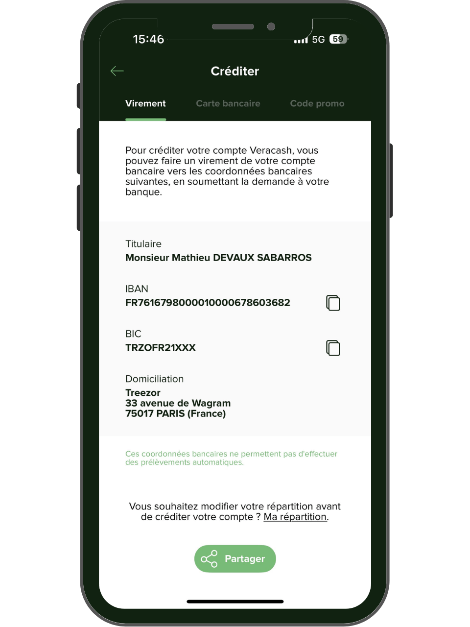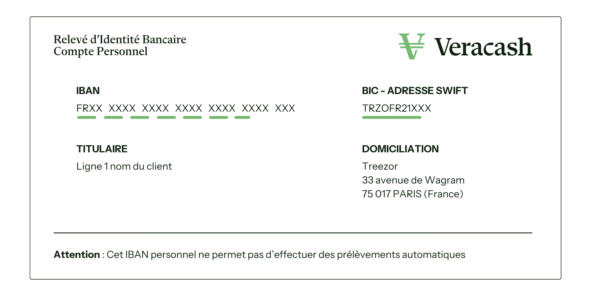 En revanche, il n’est pour l’instant pas possible d’utiliser votre IBAN Veracash pour mettre en place des prélèvements automatiques.