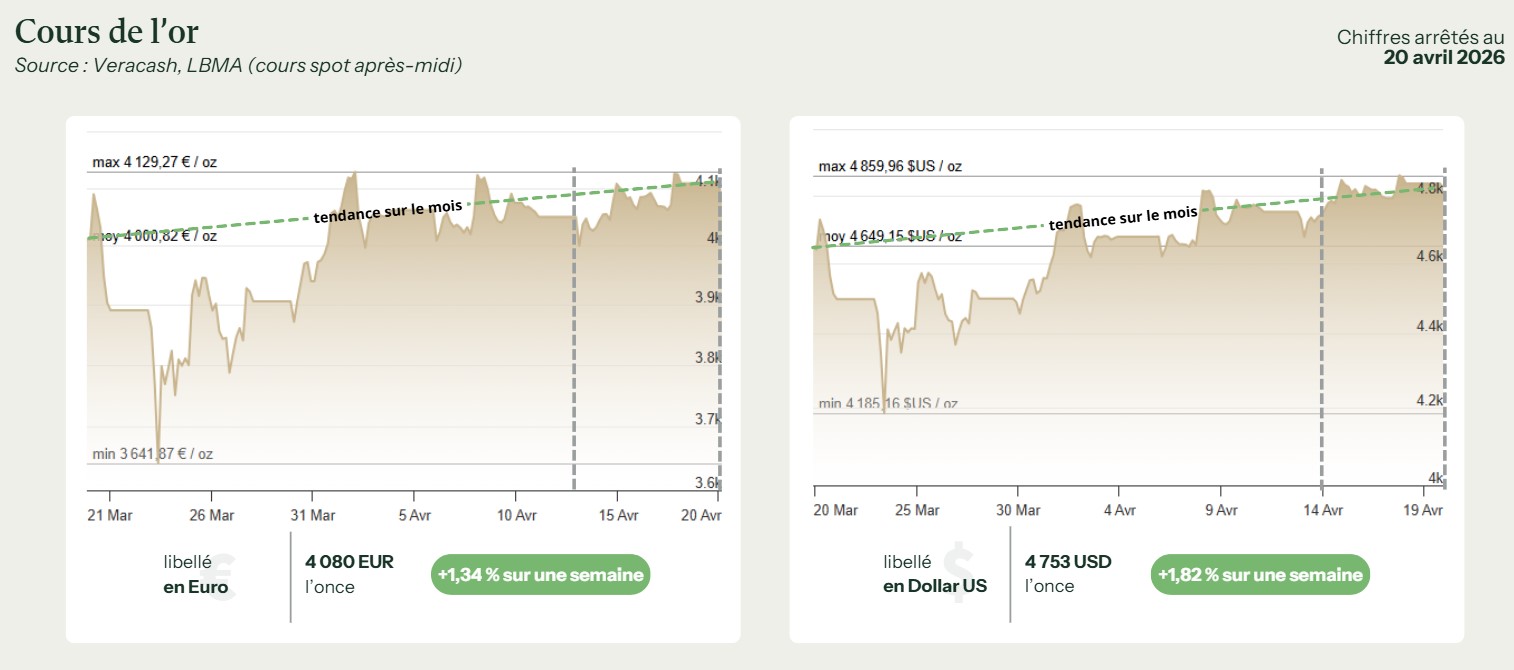 Au final, la semaine du 13 au 20 avril confirme que l’or reste un actif très sensible au moindre changement de perception sur l’Iran, le pétrole, les taux et le dollar. Le métal a bien retrouvé un certain équilibre, autour de 4 070 € et 4 750 $, mais cet équilibre reste fragile et dépend largement de l’évolution du conflit au Proche‑Orient et du scénario monétaire américain. Pour l’investisseur, le message est clair : l’or conserve son statut de refuge, mais dans le climat actuel encore dominé par l’incertitude, il avance à coups de rebonds et de rechutes, davantage porté par la peur que par une tendance linéaire.