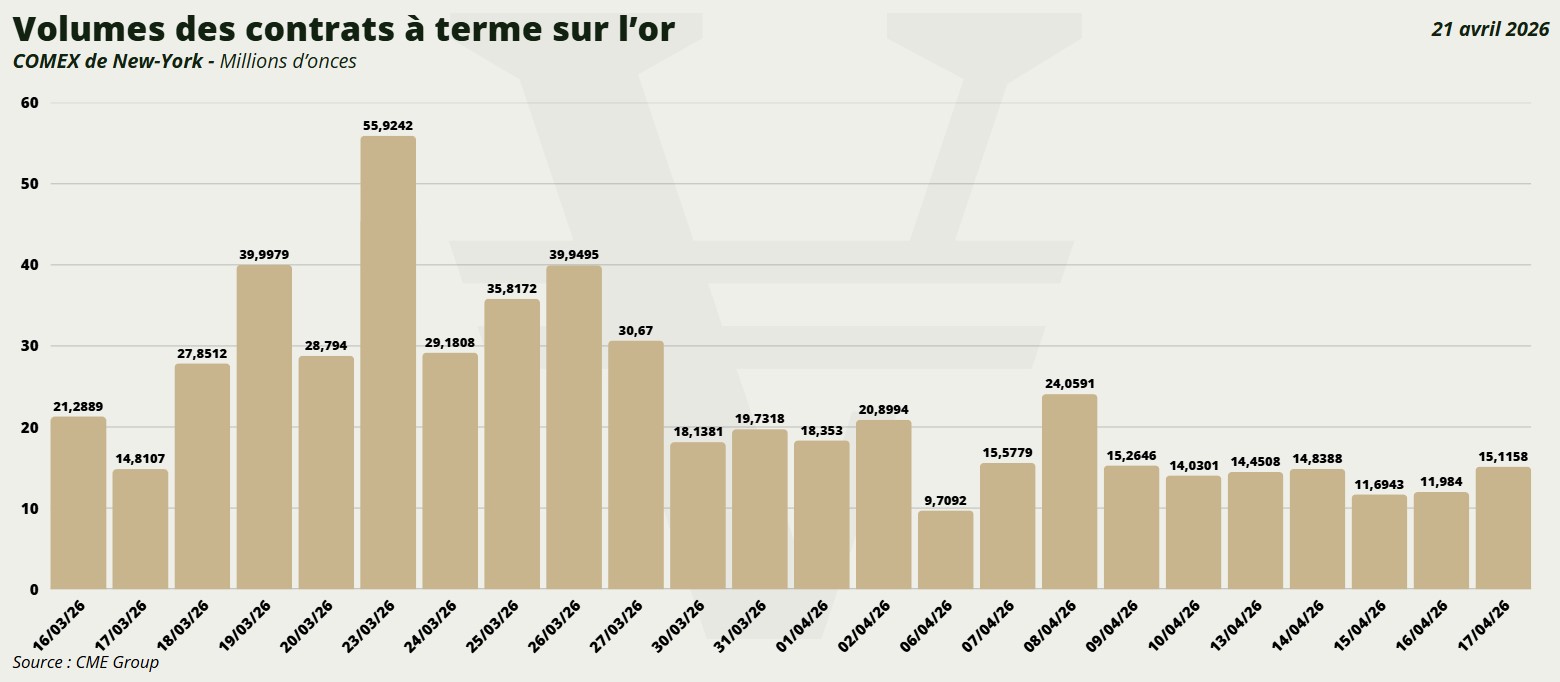Les derniers mouvements sur le COMEX confirment cette lecture, mais avec une nuance importante : après l’explosion des volumes observée autour du 23 mars (avec un pic à 55,9 millions d’onces), l’activité s’est progressivement repliée vers des niveaux bien plus modérés. On passe ainsi d’échanges encore très soutenus fin mars, souvent entre 18 et 30 millions d’onces, à des volumes plus calmes début avril, fréquemment compris entre 10 et 20 millions d’onces. Cela montre un marché qui reste actif, mais qui a clairement quitté la phase de stress maximal. Le COMEX continue donc d’amplifier les mouvements de court terme, mais dans un environnement désormais moins frénétique qu’au moment du choc de mars.
