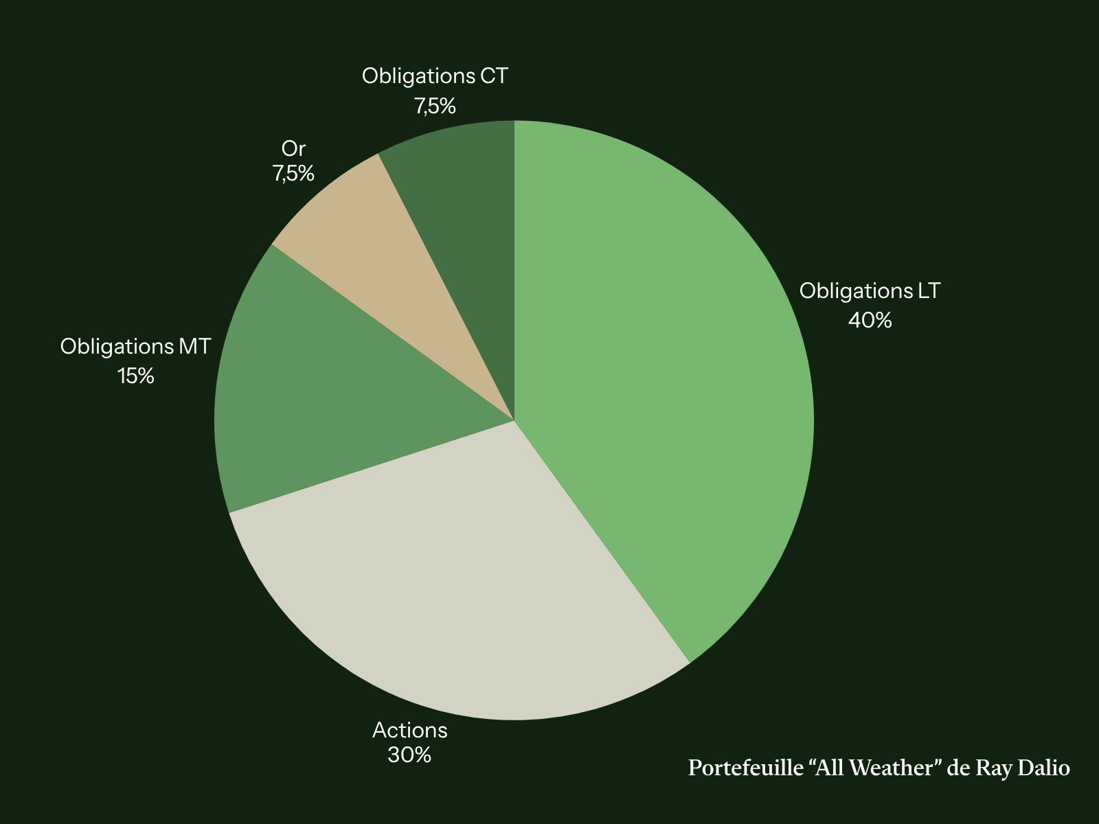 Exemple : Dans son concept All Weather, élaboré pour parer à toutes les situations économiques, l’investisseur américain Ray Dalio proposait un portefeuille composé à 40 % d’obligations à long terme, 30 % d’actions, 15 % d’obligations, 7,5 % d’or et 7,5 % d’obligations à court terme ou d’épargne liquide. En 2025, il suggérait de passer à 15 % d’or au vu des risques actuels.